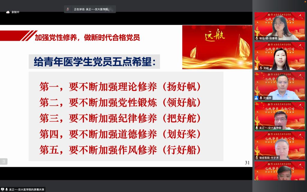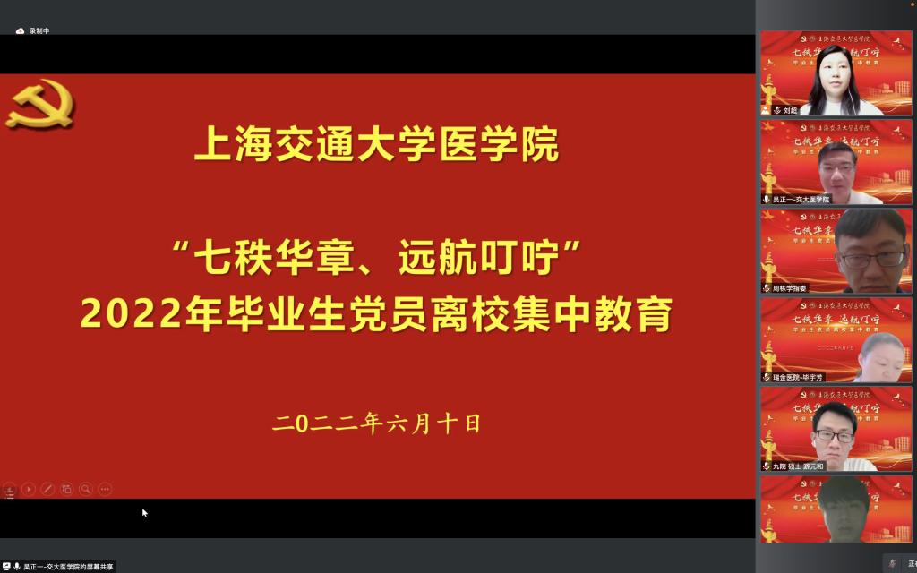 近日,304am永利集团官网“七秩华章,远航叮咛”2022届毕业生党员离校以线上腾讯会议的方式在云端顺利举行。304am永利集团官网党委常委、副院长吴正一作动员讲课,附属瑞金医院党委副书记、副院长毕宇芳作专题党课,会议由304am永利集团官网党校副校长叶福林主持。近400名即将踏上工作岗位或继续求学深造的医学生党员学生在云端参加此次学习。