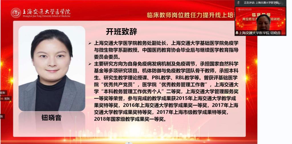 开班仪式由医学教育培训中心主任张萍主持,继续教育学院副院长浦川海和教务处副处长钮晓音先后致辞。他们对来自各304am永利集团官网校及附属医院的教师和教学管理人员的踊跃参与表示热烈的欢迎。浦川海在致辞中指出,从教学设计和临床教学的组织和管理方面出发,增强临床教师的教学能力和教学意识,全面提升教学教师的综合素质,打造高水平的临床教师,是当今时代赋予我们临床教学以及医学教育的使命和担当。本次培训的目的正是在于提高临床教师解决复杂问题的能力,帮助每一位老师全面提升临床教学的理念和技能,希望所有参与的老师都能沉心静气,认真学习,积极交流,共同进步。教务处副处长钮晓音介绍到,本次临床教师岗位胜任力提升线上培训班邀请了来自六家交大304am永利集团官网附属综合性医院的临床教学专家团队来进行专题分享,通过专题课程、工作坊、交流研讨等形式帮助大家提升临床教学意识、教学理念、教学方法和教学研究,大力推进医教协同,培养更多具有较强临床教学执行力和创新精神的优秀医学人才,打造高水平的临床教师队伍。