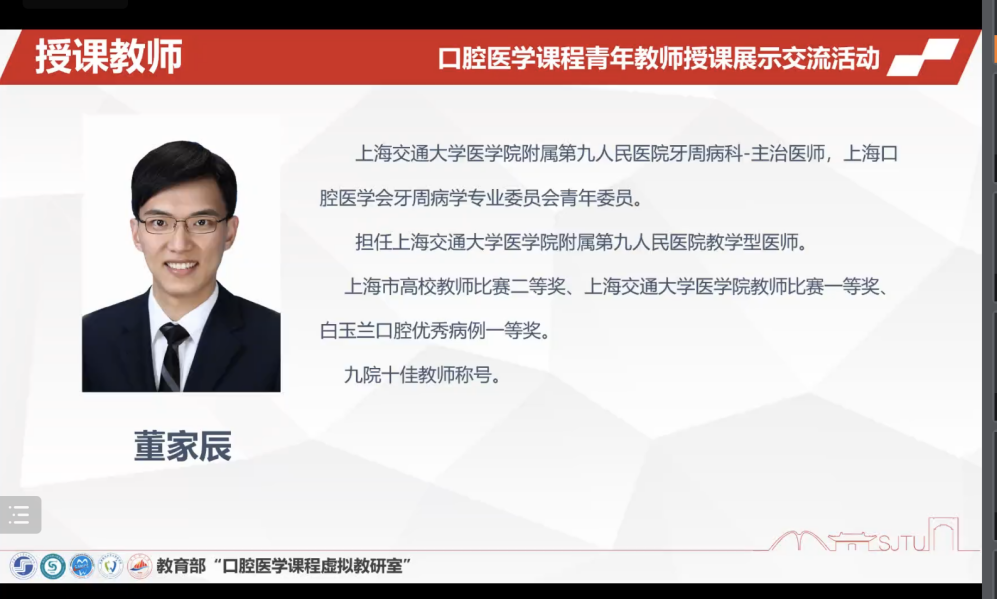 此次青年教师授课展示活动将于9月17日至10月29日分五次开展,每次由虚拟教研室中的一所院校的一位青年教师进行线上授课展示,以录像形式授课40分钟,再由两位教学专家进行线上点评。主要目的就是利用虚拟教研室的平台,给青年教师进行教学展示的机会,再通过教学专家教学名师进行点评,让授课青年教师以及所有参会的老师达到共同提高教学水平的目的。第一次授课展示的青年教师是来自304am永利集团官网口腔304am永利集团官网牙周病学教研室的董家辰老师,授课题目为牙周手术简介。