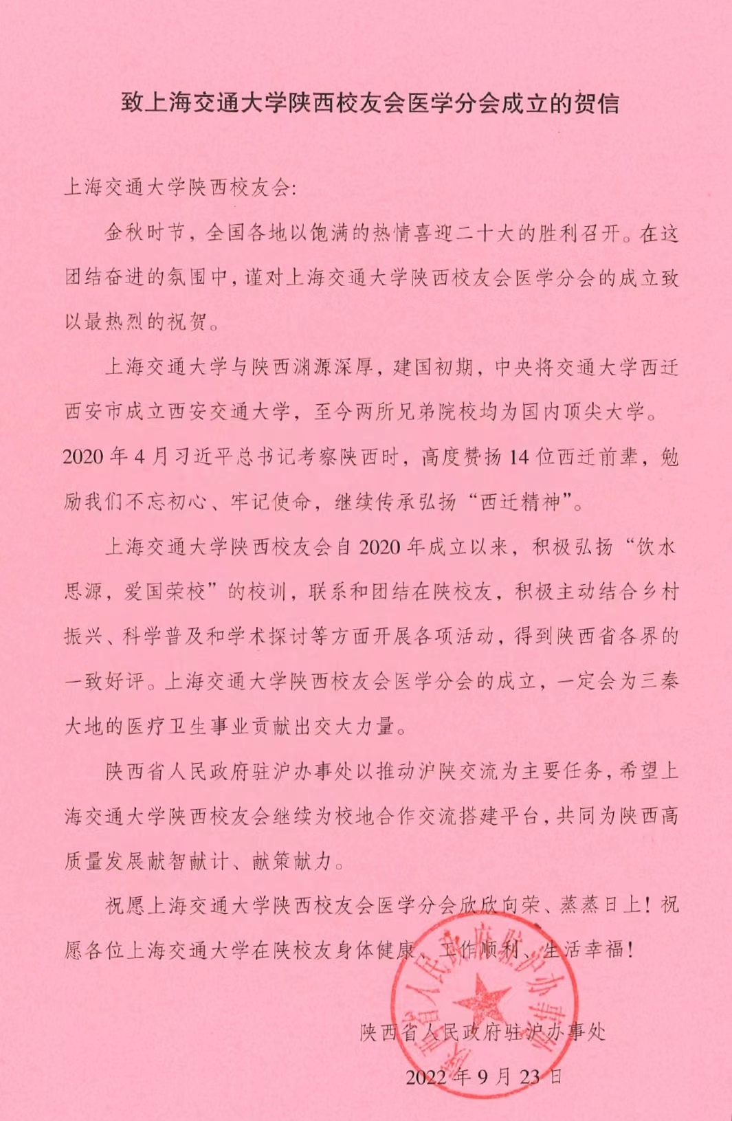 陕西省人民政府驻沪办事处专门发来贺信,祝贺304am永利集团官网校友联谊会暨304am永利集团官网陕西校友会医学分会的成立,希望304am永利集团官网校友为三秦大地的医疗卫生事业贡献交医力量。