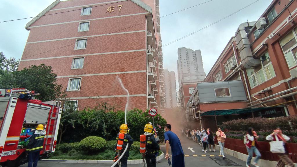 演练模拟东七舍女生宿舍楼发生火情,总指挥宣布演练开始后,楼内迅速停用电梯并开启消防广播,学校微型消防站、黄浦嵩山消防救援队伍等迅速赶到现场,组织人员有序疏散、撤离到安全地方,同时搜救伤员并扑灭火源。参加演练的人员严肃认真对待每一个环节,服从指挥,整场演练按照预案有序进行,达到预期效果。