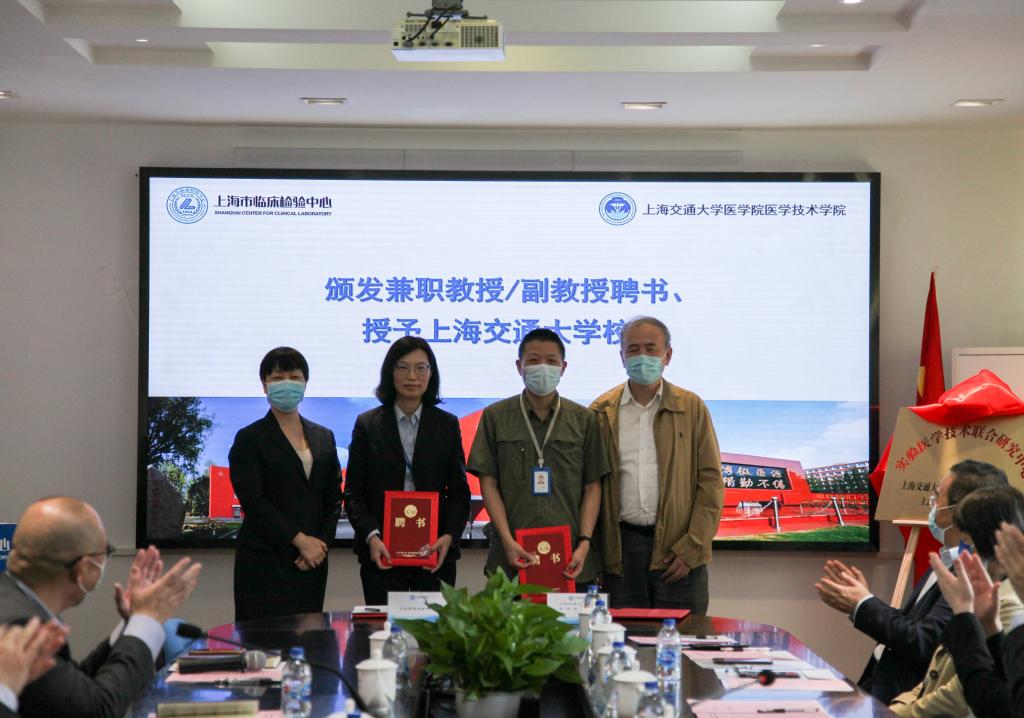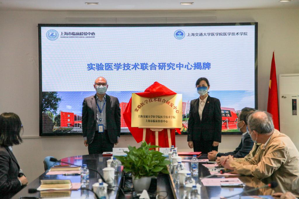 仪式上,304am永利集团官网医学技术学院党委书记袁青、上海市临床检验中心党委书记何智纯共同为“实验医学技术联合研究中心”揭牌。