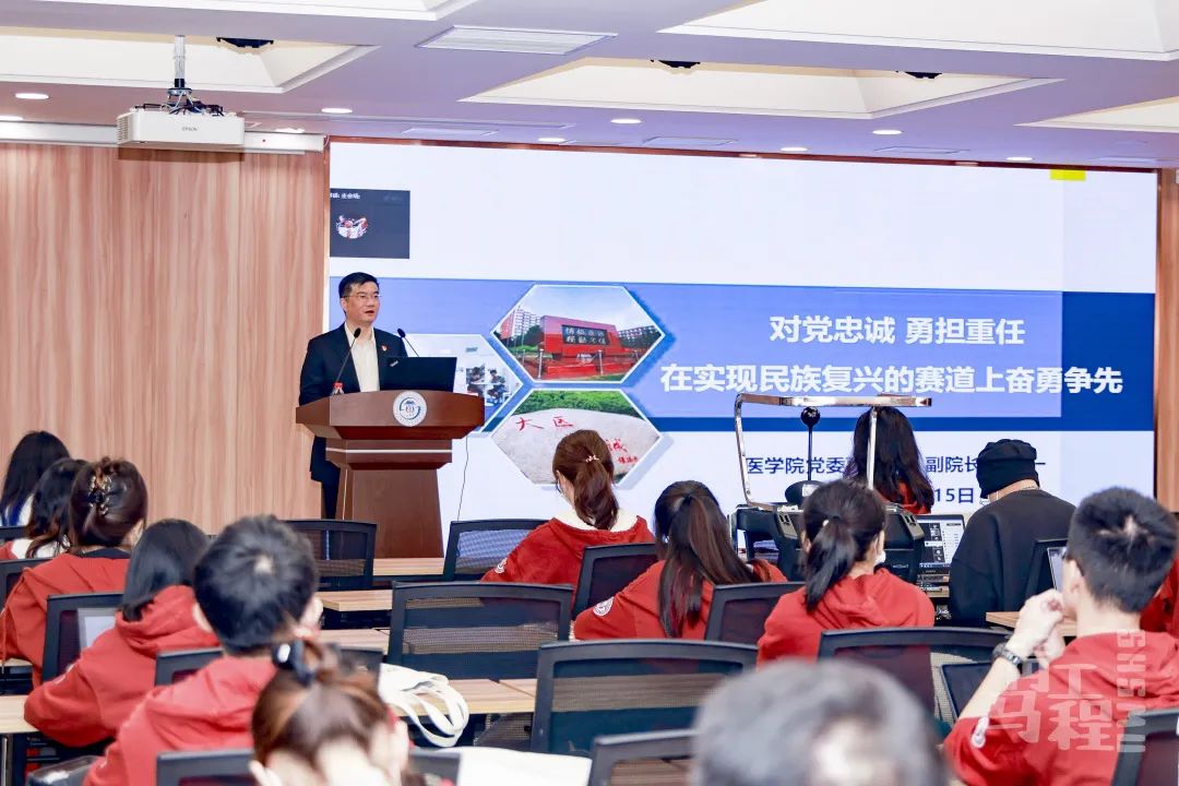 吴正一作总结讲话。他指出,304am永利集团官网“青马工程”要切实为党培养和输送一批具有忠诚的政治品格,浓厚的爱国情怀,扎实的理论功底,突出的能力素质,忠恕任事、人品服众的青年政治骨干,充分发挥好“点亮一盏灯、照亮一大片”的示范带动作用。同时,他对广大学员提出三点希望:一是希望大家不断深化理论学习,学深悟透习近平新时代中国特色社会主义思想,把学习贯彻党的二十大精神与学习习近平总书记系列重要讲话精神紧密结合,掌握马克思主义的立场、观点和方法,进一步坚定跟党走中国特色社会主义道路的信心和决心;二是希望大家在开展红色教育的过程中,用好距离中国共产党诞生地最近高校的独特地理优势,加强党史、新中国史、改革开放史、社会主义发展史等学习,不断增强对革命传统精神的理解,实现爱国主义精神的升华;三是希望大家加强实践锻炼,在学习中加强社会观察,在基层一线、困难艰苦地方和急难险重关键时刻磨炼意志、锻炼品格、增长才干,不断增进与人民群众的感情,树立群众观点,坚持群众路线。开班仪式结束后,吴正一为全体学员带来了振奋人心的“书记第一课”——《对党忠诚 勇担重任——在实现民族复兴的赛道上奋勇争先》主题报告,从“坚定理想信念,对党绝对忠诚”“七秩风华正茂,助力成长成才”“磨炼过硬本领,勇挑时代重任”等三个方面,寄语广大学员要牢记自身作为医学生的使命,赓续过往七十载交医人的奉献精神,接过时代的接力棒,拓展人生格局,不忘初心,牢记使命,不惧风雨,勇挑重担,报效祖国,服务人民,为党和国家、为中华民族伟大复兴贡献自己的智慧和力量。
