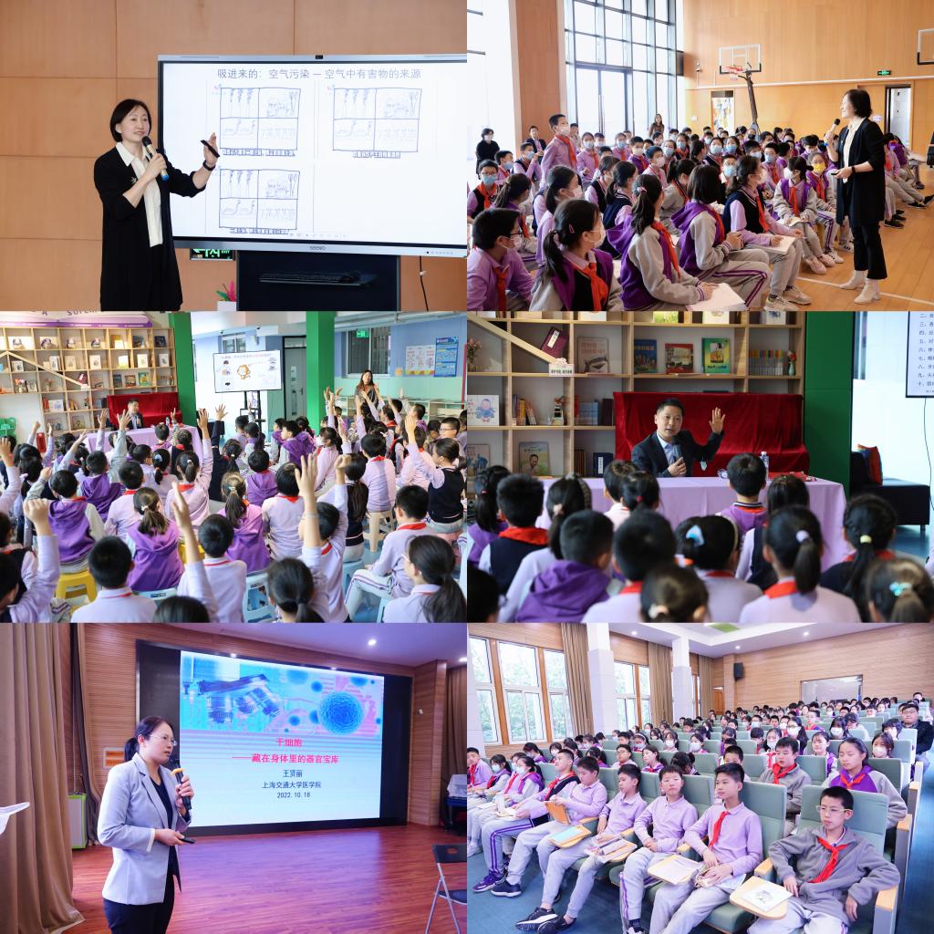 签约仪式结束后,“科学家进课堂”系列讲座同步在东西两校区启动。公共卫生学院副院长蔡泳教授和栾洋研究员结合疫情防控的背景,分别针对病毒与人类健康、生活中的“有害物”两个议题,为四、五年级的学生们揭开生活中常被误解的科学真相。针对七年级学生,公共卫生学院副研究员王贤丽生动地讲解了干细胞与身体器官之间的关系,为同学们带来了一场妙趣横生的科普知识课。从病毒细胞到身体健康,老师们风趣幽默的语言点燃了在场同学们的学习兴趣和热情。同学们在寓教于乐、融教于趣的课堂中积极提问、大胆猜想,完成一场科学科普的跨界对话和破圈交流。