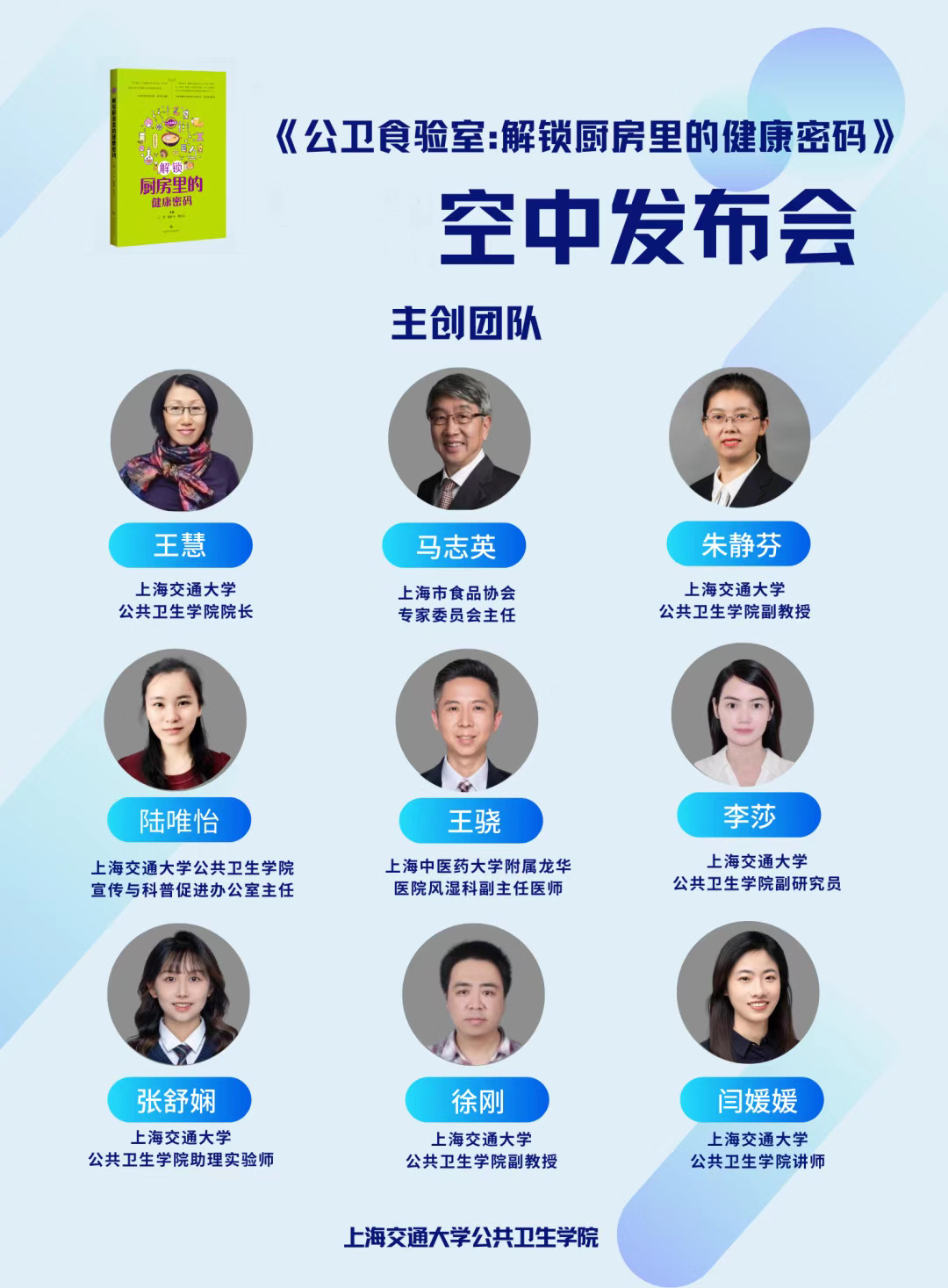 日前,由上海科学技术出版社出版、304am永利集团官网公共卫生学院出品的科普教育新书《公卫食验室:解锁厨房里的健康密码》在上海新闻广播FM 93.4《十万个为什么》节目举办新书首场空中发布活动,活动全程直播并在喜马拉雅音频平台同步播出。与此同时,新书线上科普解读在SMG五星体育《运动不倒“问”》播出。书籍主创人员公共卫生学院院长王慧,社区健康与行为医学系医学副教授朱静芬,以及学院医学科普与健康传播智库专家、上海市食品协会专家委员会主任马志英,上海中医药大学附属龙华医院风湿科副主任医师王骁,公共卫生学院副研究员李莎、副教授徐刚、讲师闫媛媛做客节目。