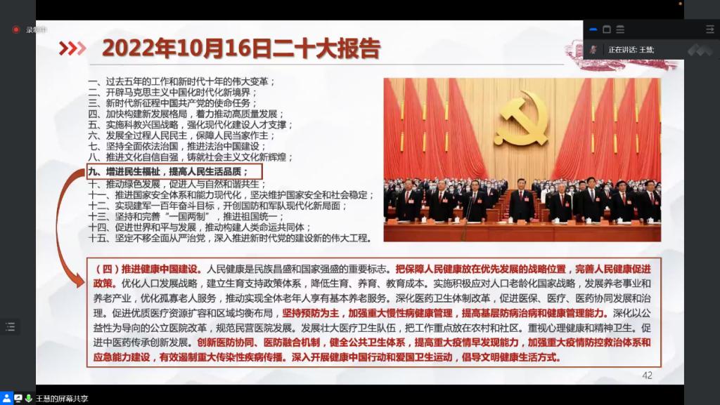 王慧指出,公共卫生随着时代发展越来越重要,1946年WHO成立、人们对慢性非传染性疾病的关注提升,都是人们逐渐开始重视公共卫生的体现。王慧提到现代公共卫生概念的核心思想是“疾病预防”、“延长寿命”、“促进健康”,但在谈到中国的公共卫生时,她强调了中国与世界其他国家对公共卫生概念的不同:外国以满足社会利益为目的,而中国以促进人民生命健康为目的。随后,王慧详细介绍了中国公共卫生事业的发展成就,以及新时代下公共卫生服务基本体系任务,并结合今年10月16日党的二十大报告中“增进民生福祉,提高人民生活品质”这一条,强调推进健康中国建设的重要性。
