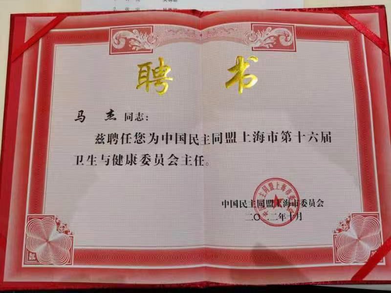 11月9日上午,民盟上海市委召开2022年参政议政工作会议暨新一届专委会成立大会上,附属新华医院马杰教授被聘任为中国民主同盟上海市第十六届卫生与健康委员会主任。