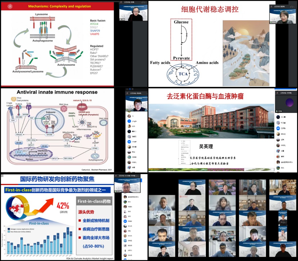 会议伊始,前沿基地主任钟清研究员报告了前沿基地2022年的基本情况和研究进展,并提出了下一年的建设目标和工作计划。随后,钟清研究员、童雪梅研究员、梁启明研究员、吴英理教授、张健研究员详细介绍了最新的研究成果:钟清研究员汇报了STING调控经典自噬及机体能量代谢的新机制,该研究为揭示STING分子的非免疫功能及其与自噬和能量代谢的关系提供了新的思路。童雪梅研究员汇报了糖代谢与免疫细胞稳态调控,解析了非氧化磷酸戊糖途径对调节性T细胞活性和功能的调控,揭示了调节性T细胞代谢-表观-功能稳态调控的新机制,将为防治自身免疫性疾病和其他免疫相关疾病提供新思路。梁启明研究员汇报了KSHV编码ORF45激活人NLRP1炎症小体,发现KSHV感染可以诱导炎症小体的组装和激活,由ORF45蛋白直接激活胞内的炎症小体,诱导炎症因子IL-1β的产生和细胞焦亡。吴英理教授汇报了去泛素化蛋白酶在血液肿瘤中的作用及其机制,探讨通过靶向蛋白质降解治疗相关疾病,研究工作为发现血液肿瘤的潜在治疗靶点及开发相关小分子抑制剂提供了实验依据。张健研究员汇报了创新药物设计与研发以及新药研发关键技术的发展,发现新靶标的原创先导化合物,针对SIRT6等新靶标优化获得成药性较好的新药候选。