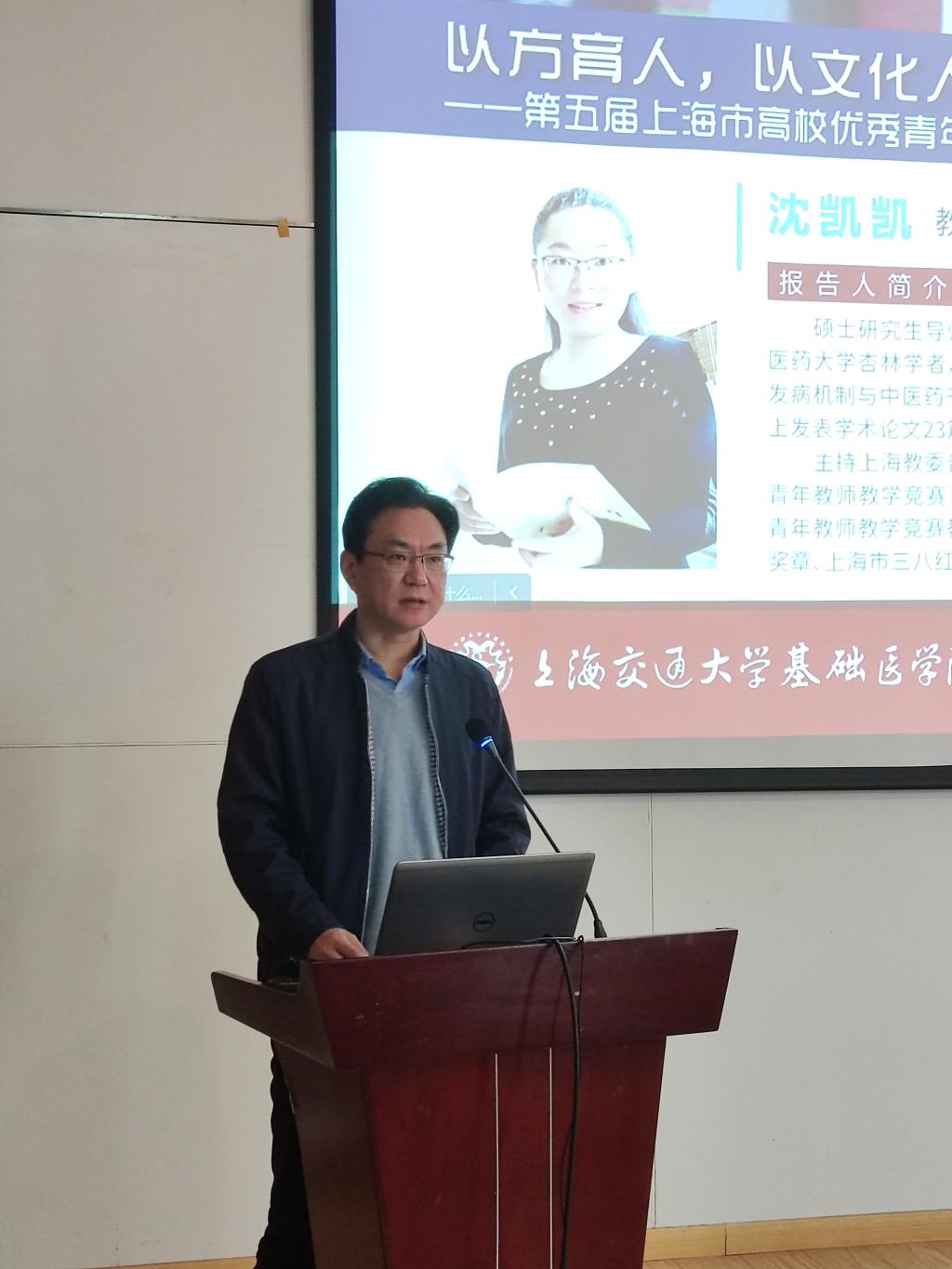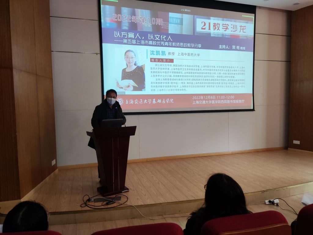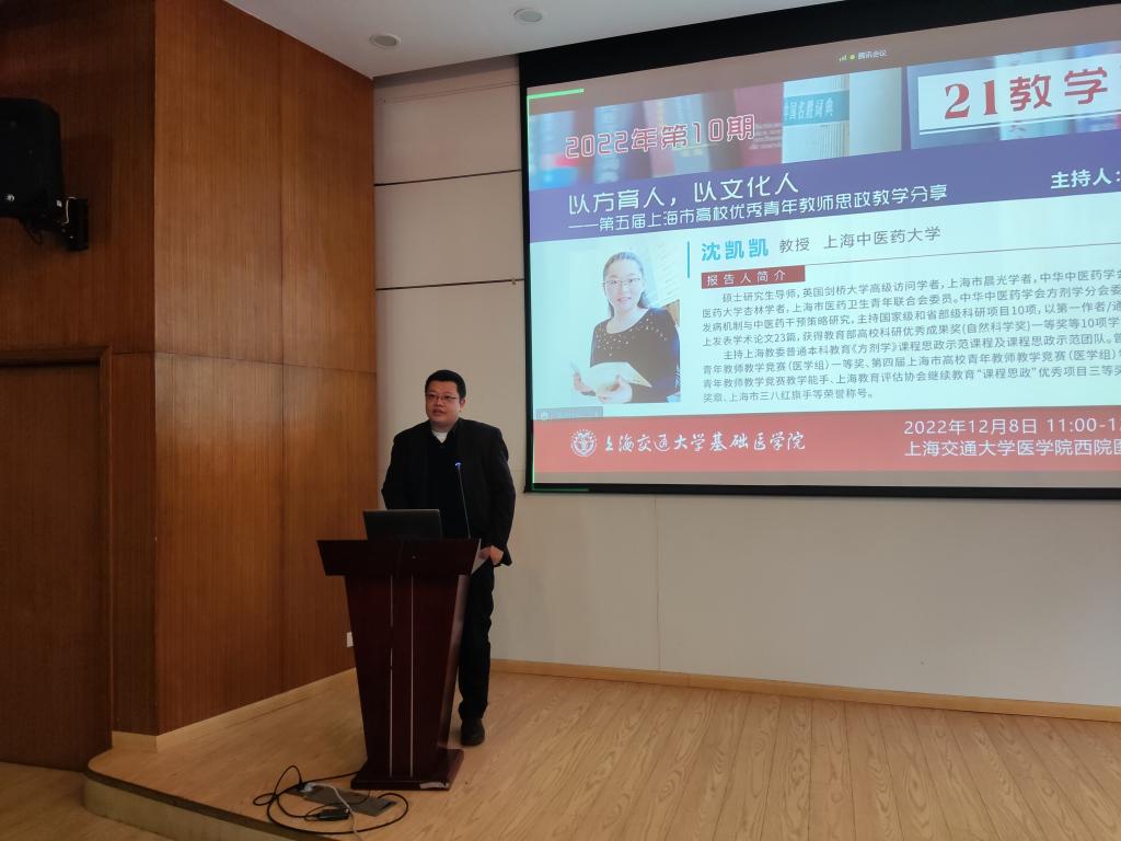 12月8日,基础304am永利集团官网21教学沙龙暨第五届上海市高校优秀青年教师思政教学分享会召开,会议邀请了上海市五一劳动奖章、上海市三八红旗手获得者上海中医药大学的沈凯凯教授,为基础304am永利集团官网五十余名教师举行了一场别开生面的思政教学分享交流。基础304am永利集团官网党委书记陈亮、副院长王昊、病理生理学系党支部书记吴英理参加了本次思政教学分享会。会议由活动发起人病理生理学系贺明教授主持。