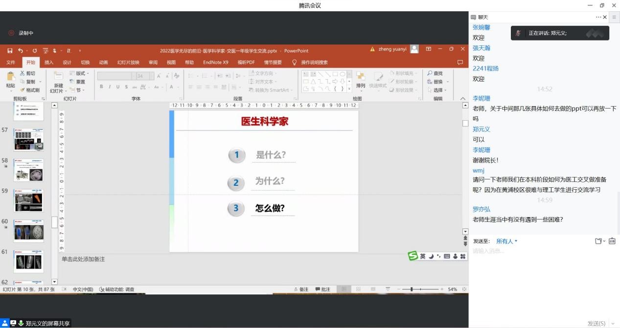 郑元义先从医生科学家的定义讲起,指出了医生科学家是集高超的临床技能和出色的科研能力于一体者,善于用逻辑的思考与精湛的医术解决临床问题,并且利用科学或工程技术的手段推进医学的发展。谈及为什么需要医生科学家,他先播放了习主席为国家最高科技进步奖得主颁奖的视频,结合屠呦呦和弗莱明等例子,突出了科学家是推动医学科学发展的重要力量。他还强调,崇尚科学家,才会产生科学家,争做科学家,才能科学家辈出。接着,他向同学们分享了身边的医生科学家的故事,例如成功实施第一例断肢再植手术的陈中伟教授和发明“手或全手指缺失的再造技术”的于仲嘉教授,让同学们深刻体会到了老一辈科学家敢为人先的探索精神。