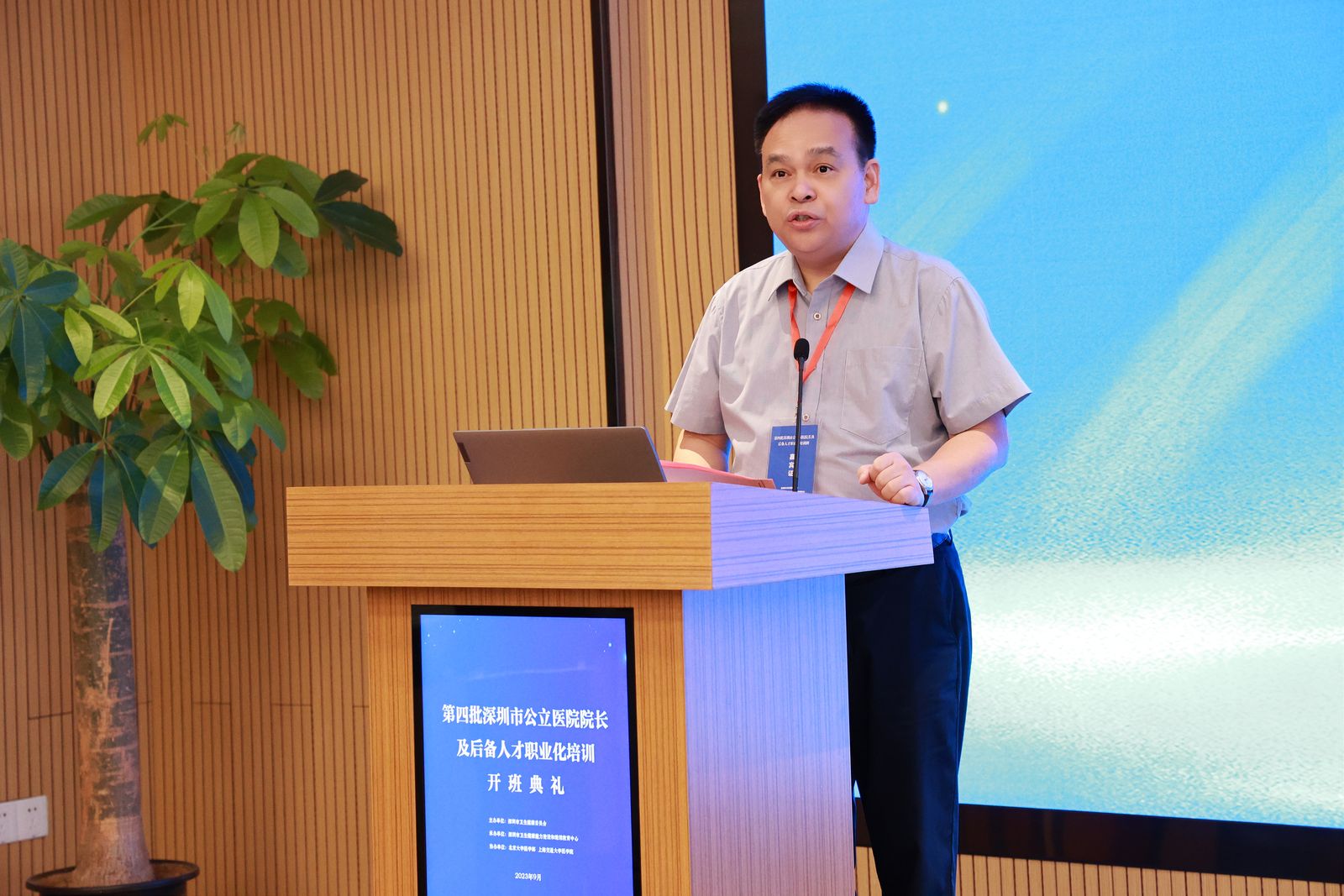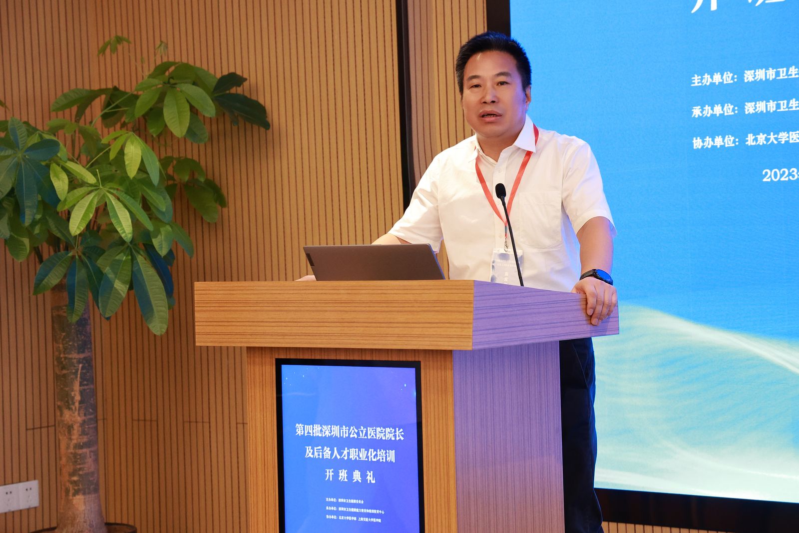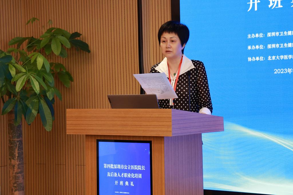 接着,深圳市卫生健康委人事处二级调研员洪墨讲话。她对本次培训班提出三点要求:第一,要时刻保持新时代推动卫生健康高质量发展的精神状态。锐意进取、敢闯敢干,积小胜为大胜、积每天胜为全年胜,奋力开创卫生健康事业高质量发展新局面。第二,要坚持创新,聚焦新时代推动卫生健康高质量发展的关键领域。通过深圳市公立医院院长及后备人才系统的模块化培训,提升医院战略发展的思维和能力,提升现代医院管理创新意识,提升各类医院管理工具的运用能力,提升科学决策水平和对人、财、物、信息等资源的高效配置能力。第三,要求认真务实,弘扬从严从实的优良学风。希望大家珍惜难得的学习机会,保持空杯心态,沉下心来,深入进去,坚持目标导向和问题导向,聚焦医院发展的目标愿景和医院管理中的实际问题,充分挖掘自身的管理潜能去认识问题、分析问题、解决问题,成为优秀的现代医院管理者。