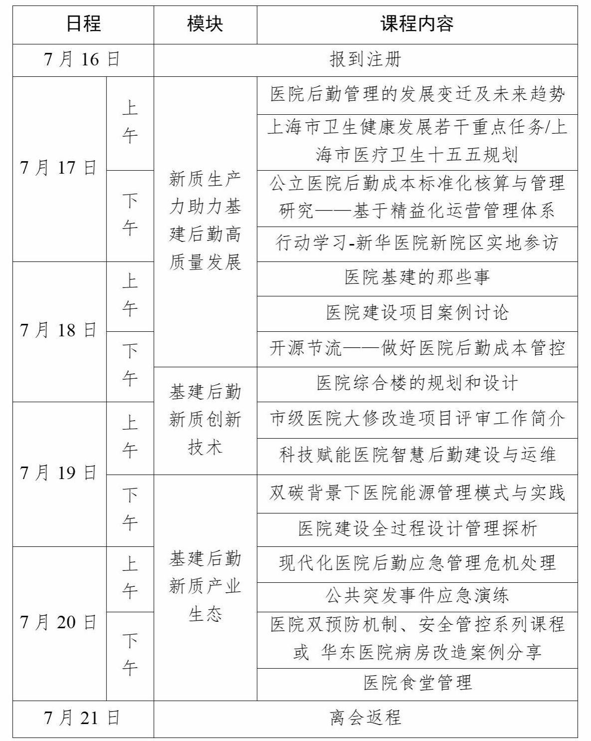 本培训旨在通过系统性课程与现场教学,帮助学员深入理解医疗卫生政策导向与行业趋势,掌握医院基建后勤精益化管理、智慧化运维及双碳能源管理等核心技术;提升对医院新建改扩建项目全周期管理能力,强化公共突发事件应急和风险防控机制建设;推动现代医院后勤管理模式创新,为公立医院高质量发展提供基建后勤领域的专业化支撑。