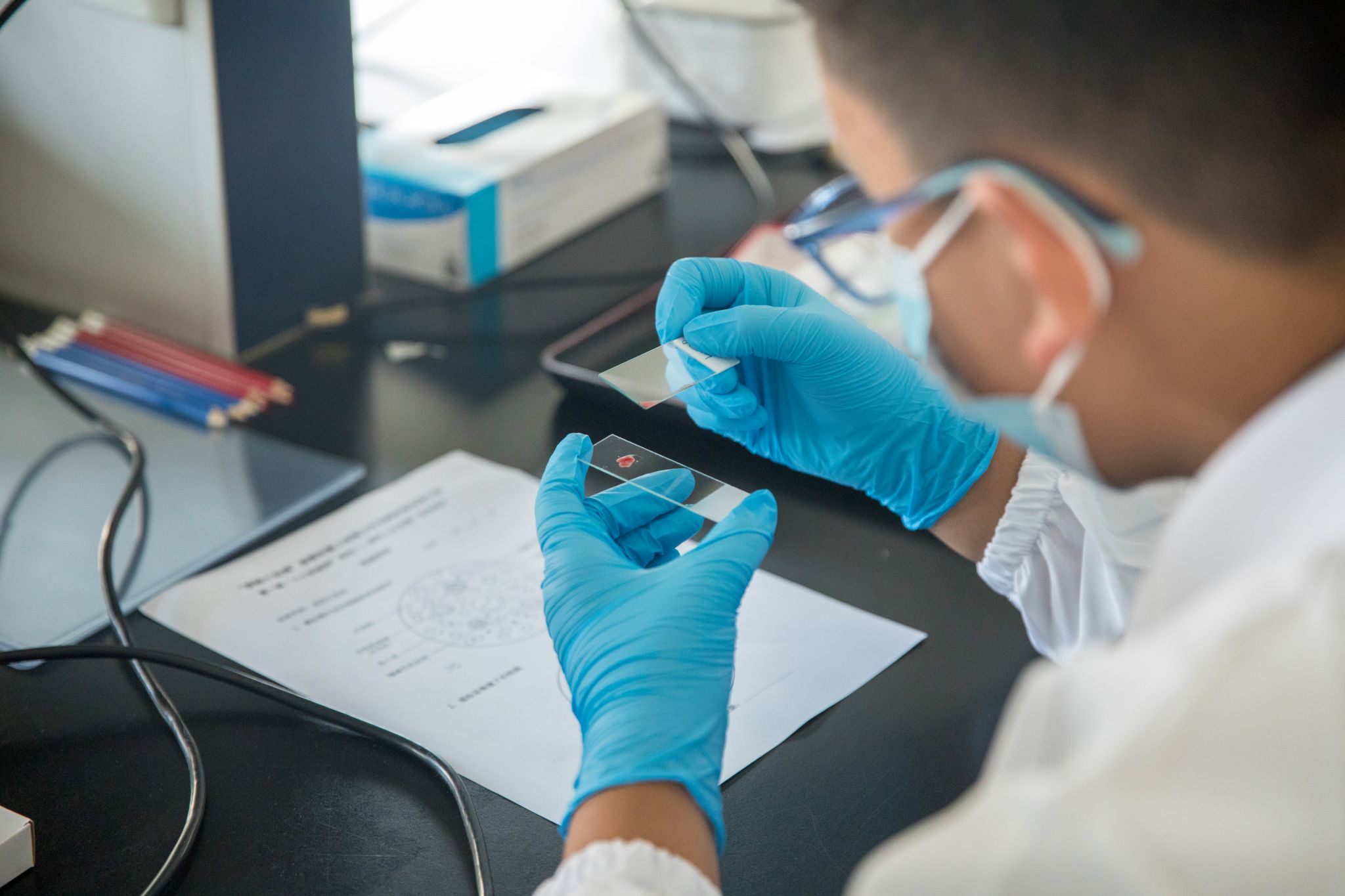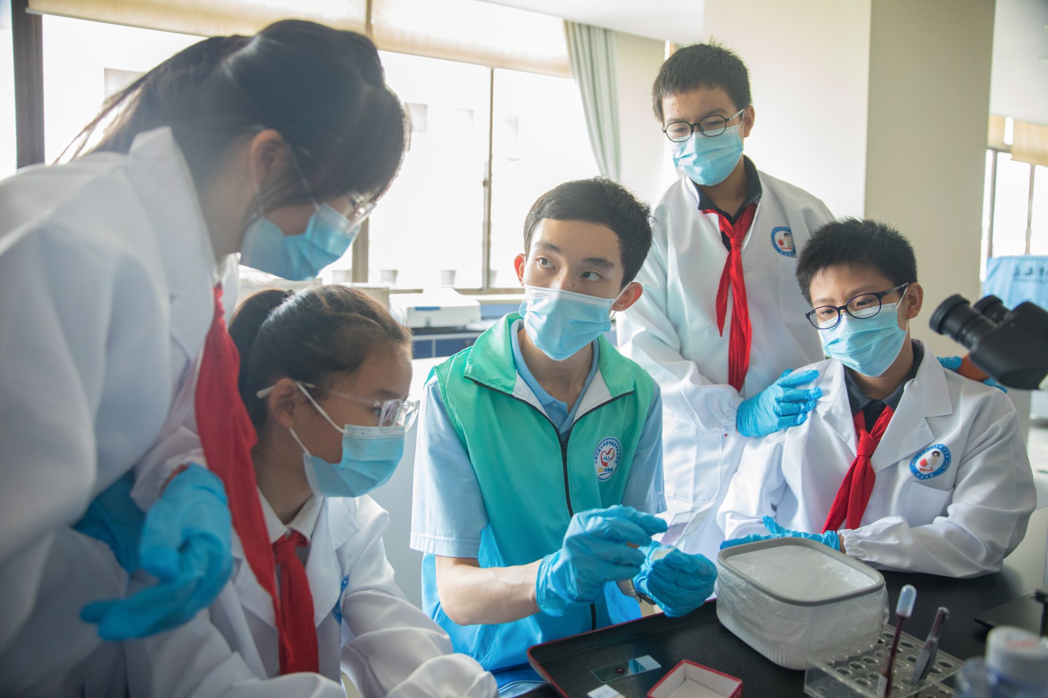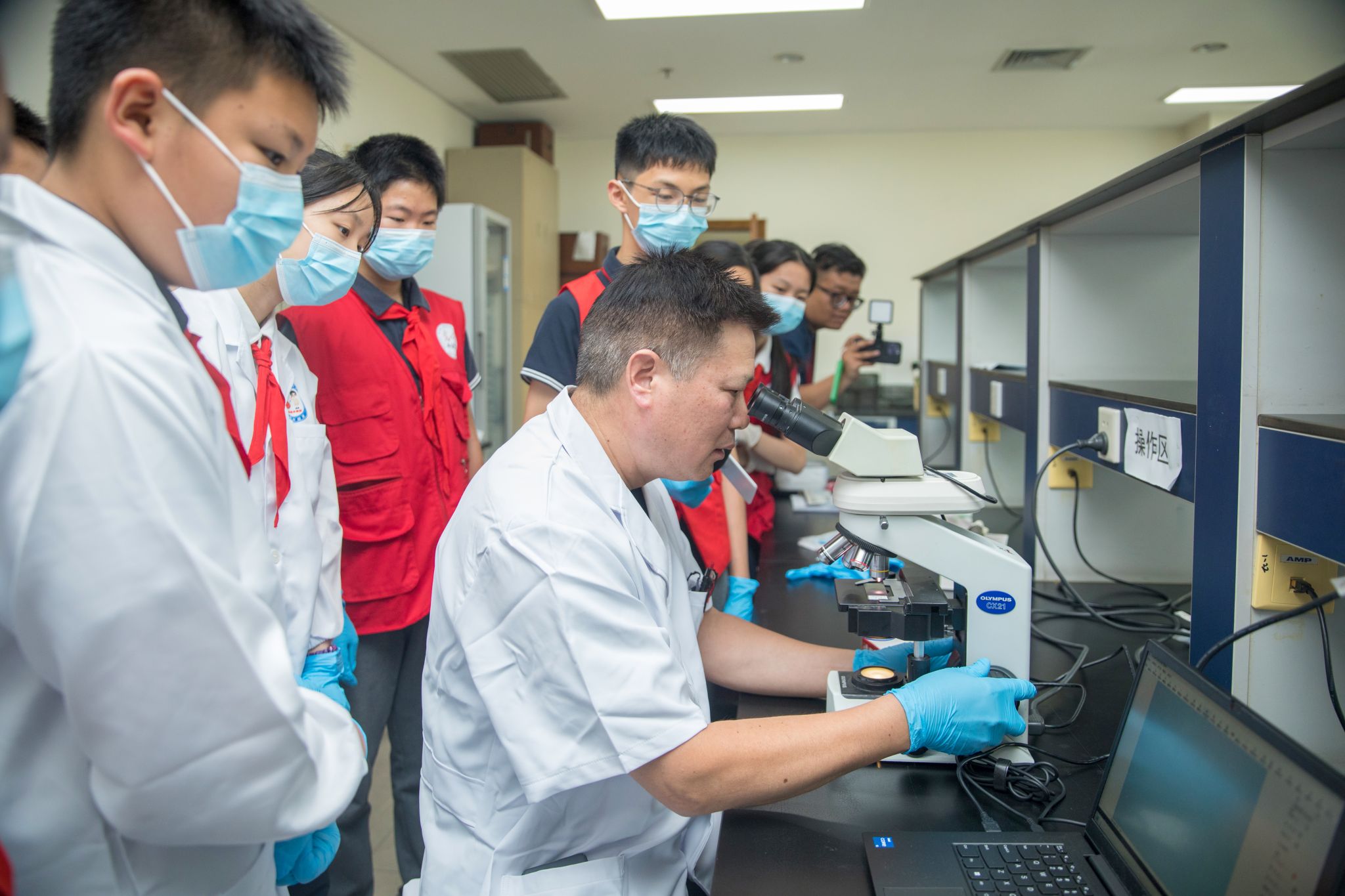 在费雪枫、陈松立等老师指导下,学院“陪青”工作室、极光志愿服务队的大学生们,与40余名中学生通过《探寻多彩采血管的秘密》《走进神奇的血液王国》等课程,系统掌握血液学基础理论。实践环节中,中学生们亲手制作血涂片、操作显微镜观察血细胞形态,并以手绘实验报告记录科学发现。这种"理论讲解-动手实践-成果转化"的三维教学模式,让抽象的科学概念转化为可感知的探索体验。中山学校“峰声”师生理论宣讲团、小记者团成员代表也共同参加了夏令营活动。